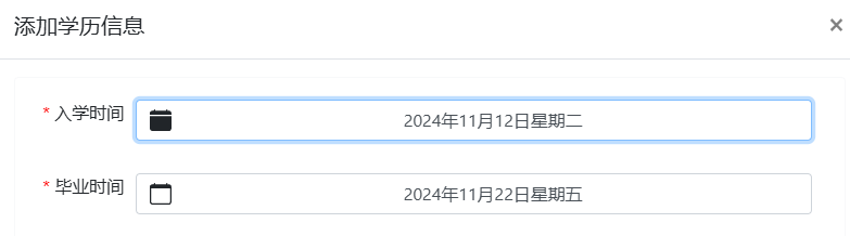 1.修改“入学时间”和“毕业时间”。“入学时间”应与毕业证书上的保持一致,“毕业时间”应为毕业证书签发日期。