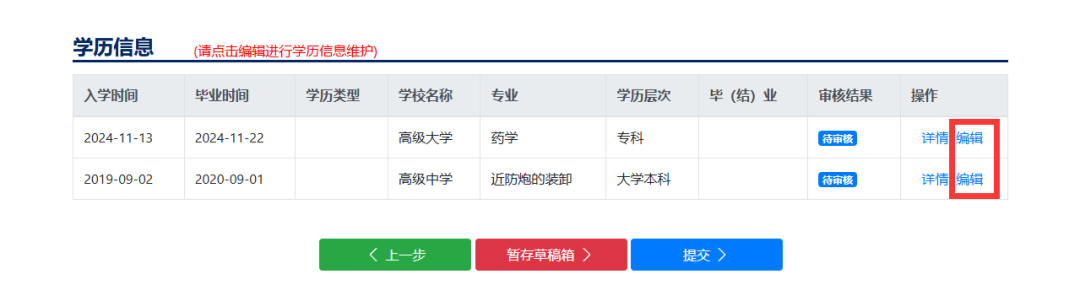 3.学历信息中标记为“禁止操作”的不允许修改,未标记为“禁止操作”的可以点击“编辑”按钮对学历信息进行编辑,具体流程参照第(三)款。编辑完成后提交至协会审查。
