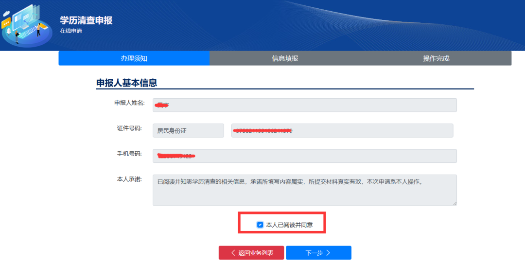 在“申报人基本信息”中核对“申报人姓名”“证件号码”“手机号码”,并仔细阅读“本人承诺”内容,勾选“本人已阅读并同意”后,点击“下一步”。