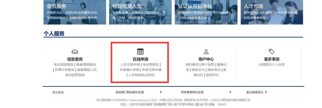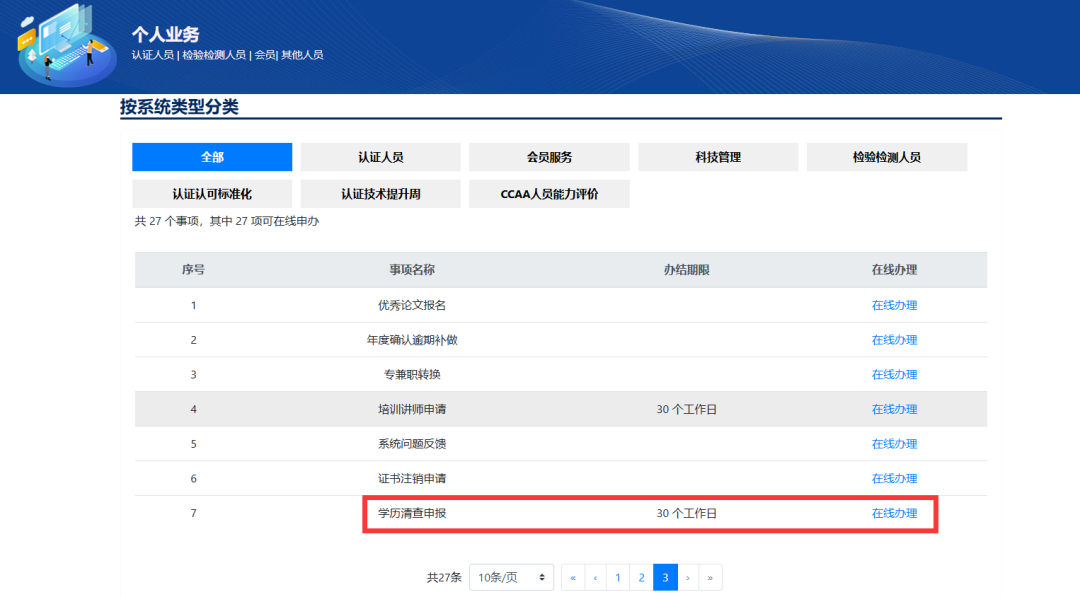登录“CCAA综合服务平台”(https://service.ccaa.org.cn/),在首页右上“常用服务”中选择“学历清查申报”,点击进入;或点击首页下部“在线申请”,进入后翻页找到“学历清查申报”功能,点击后方“在线办理”。