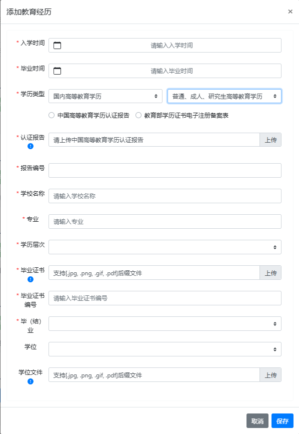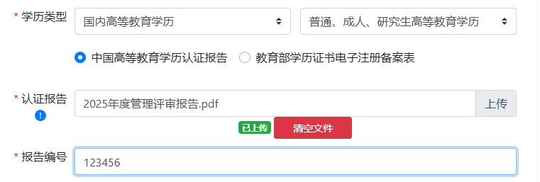2.上传学历证明。选择“学历类型”,勾选“证明类型”,上传学历证明文件,并填写“证明文件编号”。其中“国内高等教育学历(普通、成人、研究生高等教育学历/自学考试学历/军队院校学历)”提交中国高等教育学生信息网(简称“学信网”)出具的“教育部学历证书电子注册备案表”或“中国高等教育学历认证报告”;“党校学历”提交相应院校出具的学历证明;“国(境)外学历即外国大学、中外合作办学大学学历和港澳台地区大学学历”:提交教育部留学服务中心出具的相关学历学位认证书。其中“教育部学历证书电子注册备案表”中的“在线验证码” 应为链接可点击状态,有效期设置为6个月并可正常打开文件。