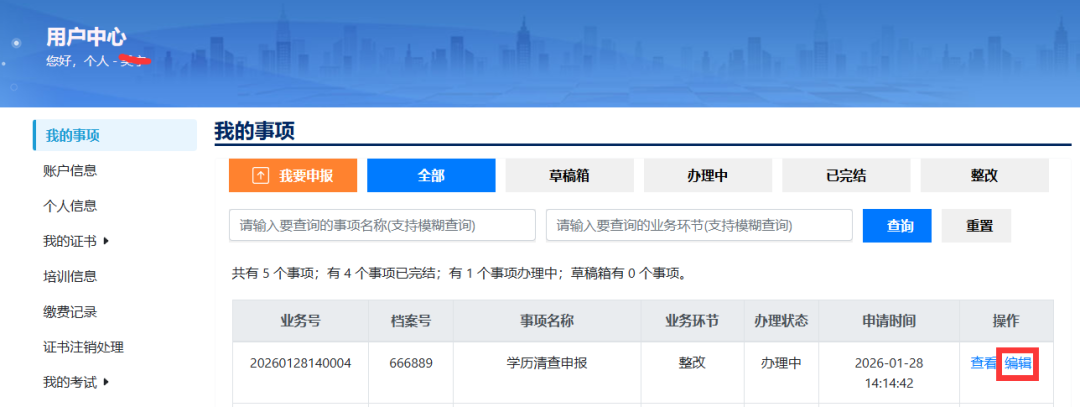 2026年5月6日上午10时关闭学历清查申报功能,开始集中审查环节。审查中存在重大问题的将按照不通过结论送相关部门进行资格处置;审查中存在轻微问题的将退回至申报人处进行整改,整改限1次,整改时限为15天,整改后仍不合格的也将按照不通过结论送相关部门进行资格处置;审查中未发现问题或整改后合格的按照通过结论进行处理,同时按照申报信息对原信息进行更新。整改操作流程如下: