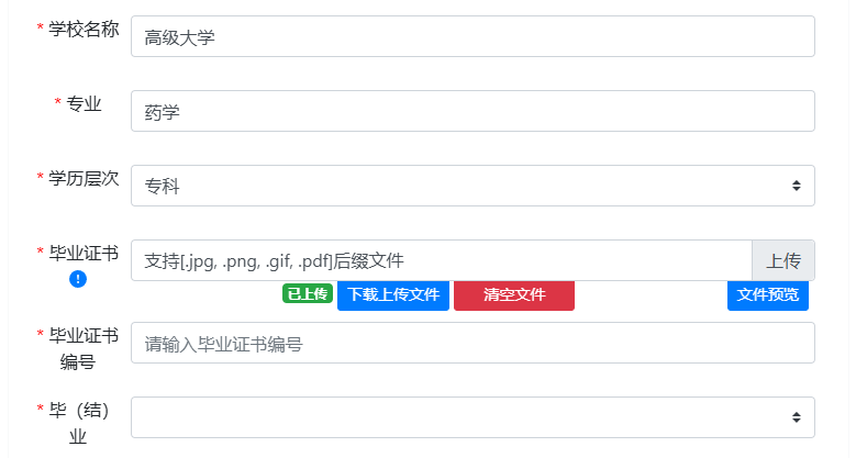 3.完善毕业证书和学位证书信息。严格按照毕业证书内容填写“学校名称”、“专业”、“学历层次”,上传“毕业证书”(原件彩色扫描件),填写“毕业证书编号”、“毕(结)业”等信息。严格按照学位证书内容填写“学位”类型,上传“学位证书”(原件彩色扫描件),无学位证书不需要填写和上传。申报人所提交的毕业证书中姓名、出生年月等信息与有效身份证件不一致的,应在“信息变更证明”处上传户口簿信息更改页等证明文件。